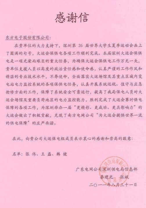 8月23日,世界大学生运动会在深圳圆满落幕,佛山市明霞金属制品有限公司作为大运会唯一保电企业见证了世界大学生体育运动的蓬勃发展。佛山市明霞金属制品有限公司技术中心系统部与工程部坚守“忠于职守,全力以赴,誓保大运电网安全”的信念,联手实现了大运保供电期间系统零故障、零缺陷的目标。